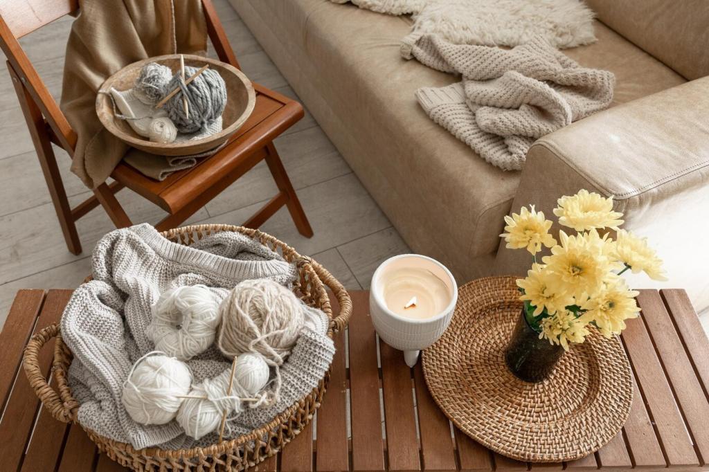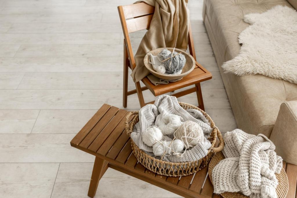 Geölte Hölzer duften angenehm und lassen sich punktuell ausbessern. Kork dämpft Geräusche und wärmt, ideal für kleine, akustisch sensible Räume. Welche Oberflächen fühlen sich für dich am heimeligsten an? Verrate uns deine Favoriten.